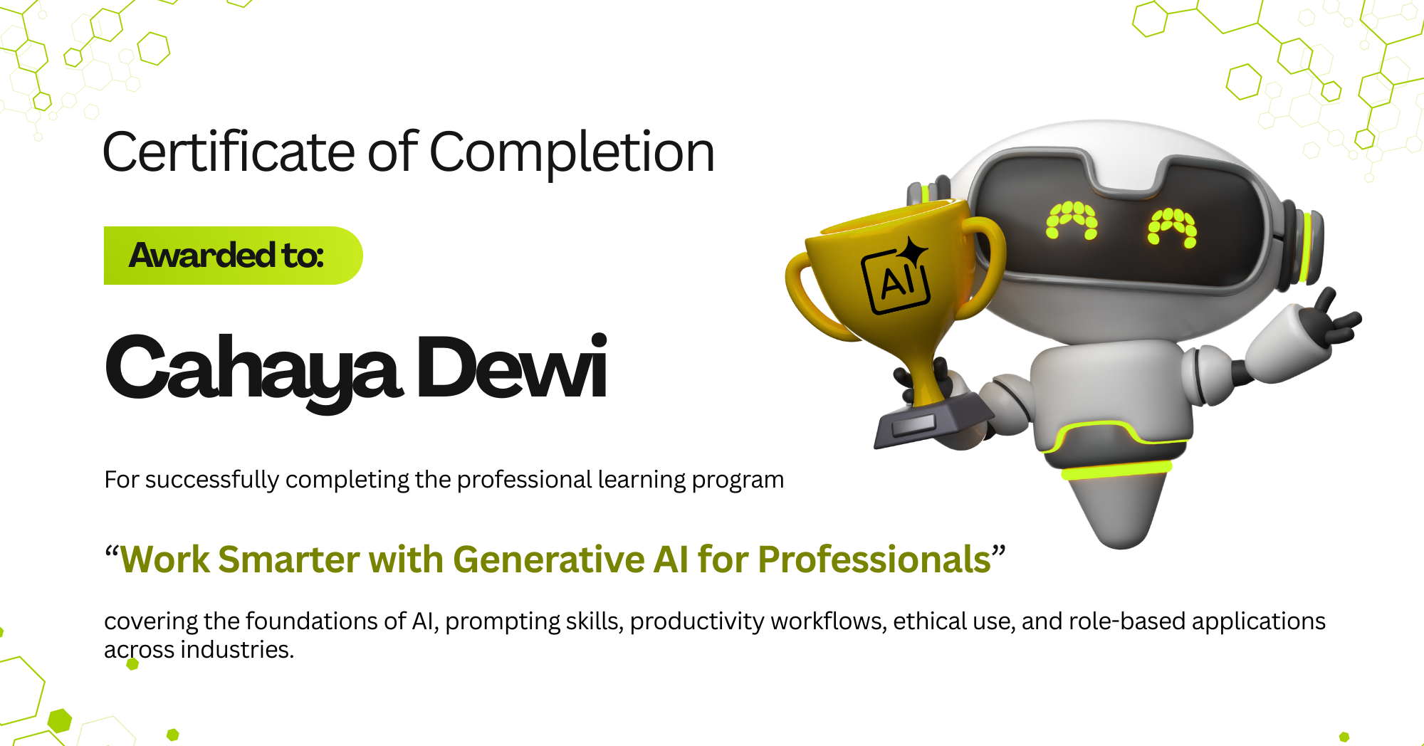 Yes. On completing Work Smarter with Generative AI for Professionals, you’ll receive a Certificate of Completion. You can showcase it on LinkedIn or your resume to highlight your AI skills to recruiters and employers.